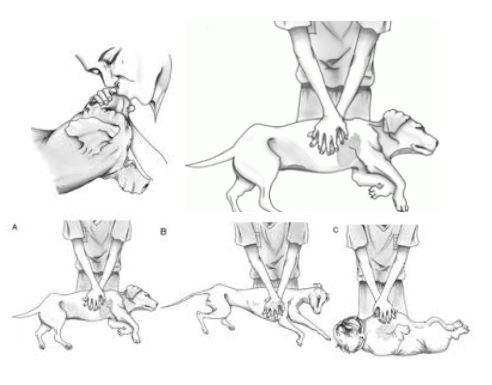 4 - Faites, le massage cardiaque. Compressez le flanc gauche 5 (petits et moyens chiens) à 10 fois (grands chiens) de manière rapide et ferme.